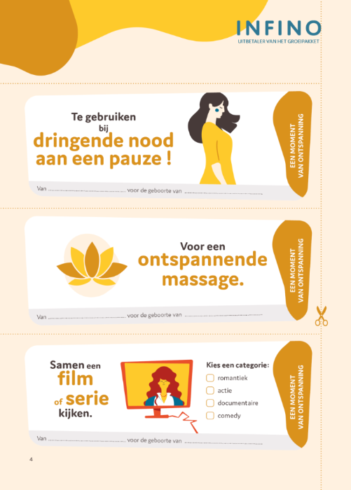 Deze bonnen zijn misschien wel de allerleukste om te geven. Nieuw ouderschap kan soms eenzaam zijn. Echt ontspannen lukt beter met een extra volwassene in de buurt. Gedeelde zorg is halve zorg en dat geldt voor baby's dubbel zo hard.Dus: jij biedt - geheel belangeloos - aan om samen te ontspannen.