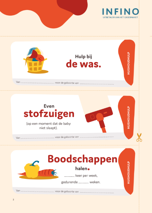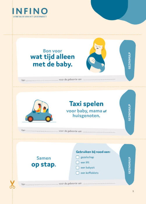 Gebruik deze babybonnen om ouders te steunen en het netwerk rondom het gezin te versterken. Deel ze gerust met iedereen die helpt, want samen staan we sterker.